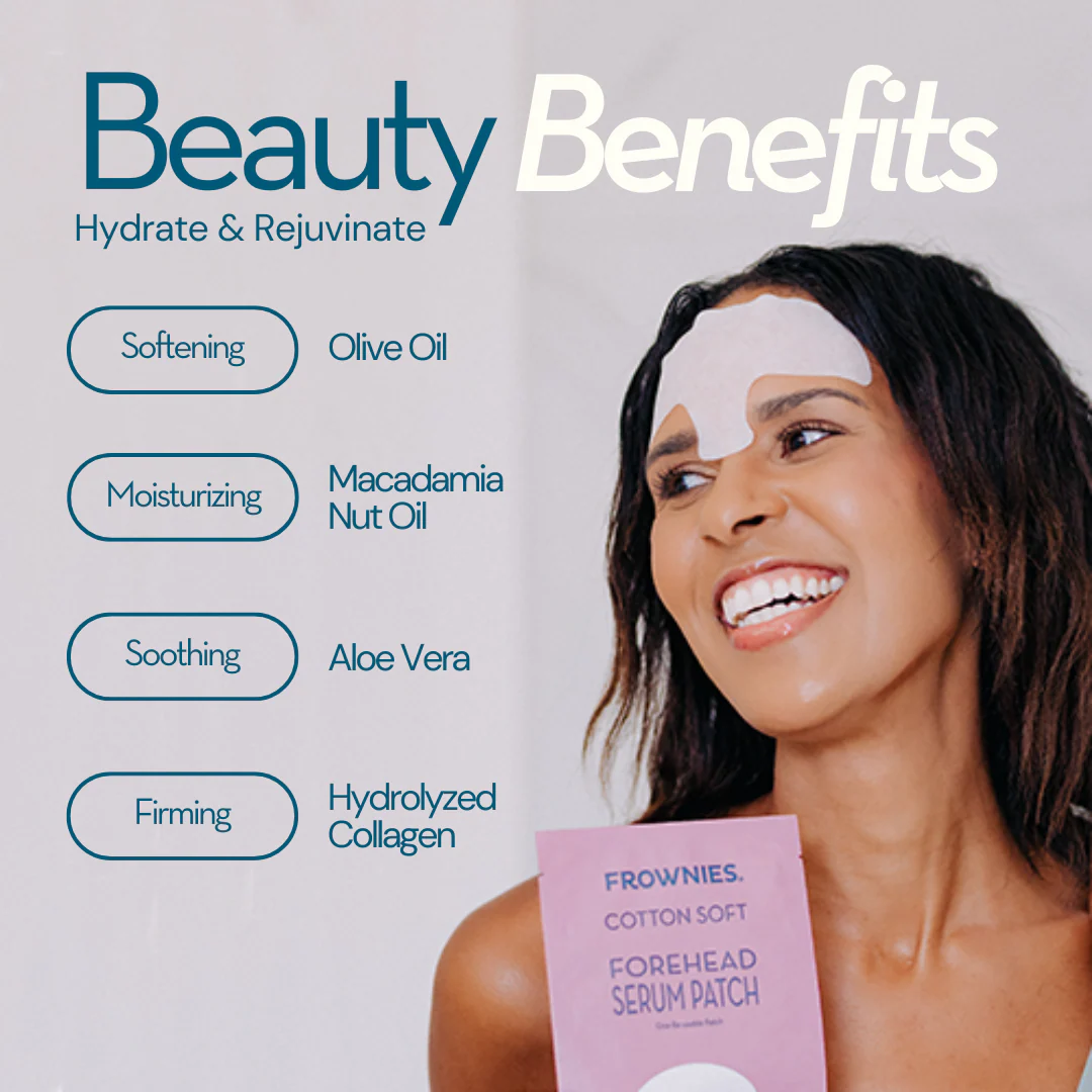 The Frownies Serum Patch is your go-to for an intensive, deep moisturizing treatment. It's designed to hydrate your skin, smoothing out fine lines with a rich blend of natural ingredients, including collagen, olive oil, and vitamin E.